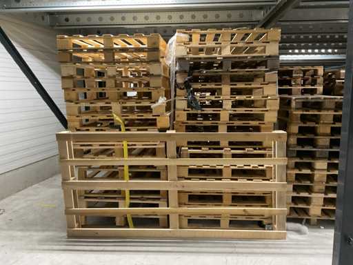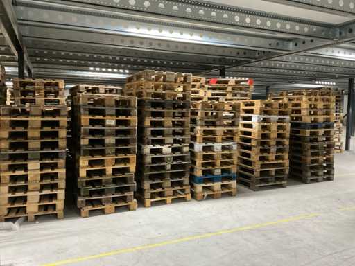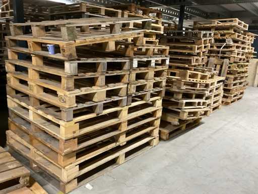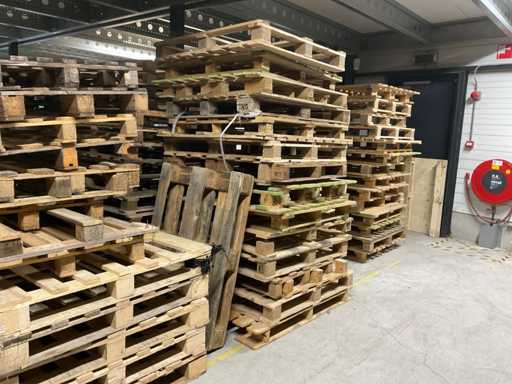 Batch of wooden pallets in various shapes and sizes, consisting of: Euro pallets, Block pallets, Pallet length, Display pallets, etc. Total number of pallets approximately: 350 Pieces