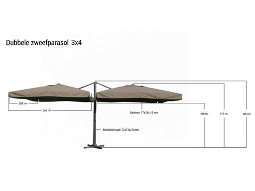 Type: U1073 DOUBLE 3X4 ORANGE The parasol is ideal for use in the garden, terrace and balcony. The large parasol comes with a parasol base. This must be reinforced with the help of, for example, terrace tiles. Maintain a weight of at least 100 kilos for this. Equipped with: Large double parasol cloth with a size of twice 300x400 cm. - Strong and sturdy frame made of aluminum. - Easy to get ready for use. - Fire retardant, thick fabric for better UV protection. - The parasol retains the heat of the sun, so it is still nice and warm in the evening when the sun goes down. - The parasol can rotate 360 degrees around its axis, so the parasol can easily rotate with the sun and you can make optimal use of the parasol.