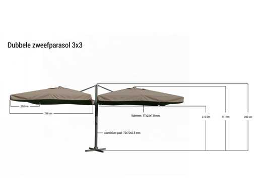 Type: U1073 DOUBLE 3X3 DG LUX The parasol is ideal for use in the garden, terrace and balcony. The large parasol comes with a parasol base. This must be reinforced with the help of, for example, terrace tiles. Maintain a weight of at least 100 kilos for this. Equipped with: Large parasol cloth with a size of 2x ø300 cm - UV protection of 50+ - Colorfast cloth - Strong and sturdy frame made of aluminum. - Easy to get ready for use. - Including parasol base. - Fire-retardant, thick cloth (300 grams) - The parasol retains the heat of the sun, so it is still nice and warm in the evening when the sun goes down. - The parasol can rotate 360 degrees around its axis, so the parasol can easily rotate with the sun and you can make optimal use of the parasol.