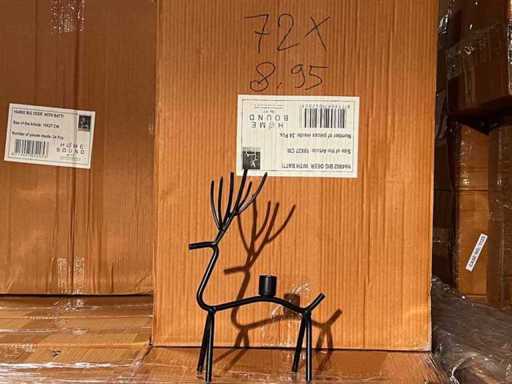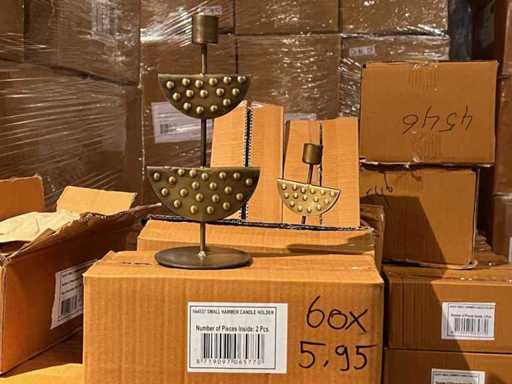 72x €19,95 wall cloth 36x €21,85 photo frame with flowers 72x €8,95 deer with batti 60x €5,95 Small Hammer Candle Holder 144x €5,95 hammer candle holder 8x €49,95 wall lamp 6x €49,95 pandent lamp Retail value total €4,800