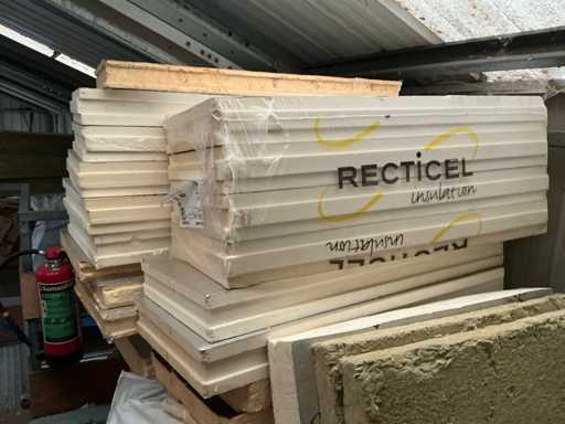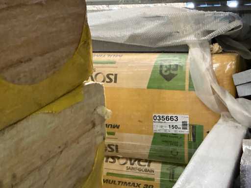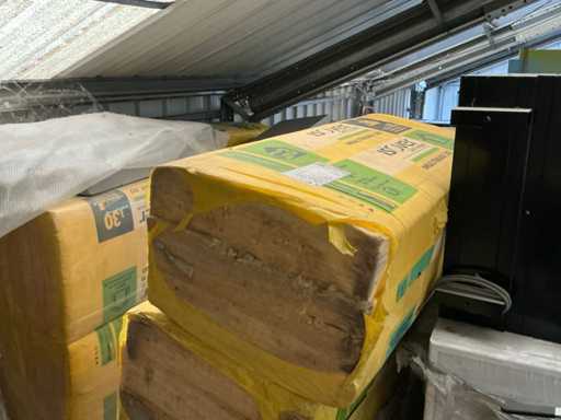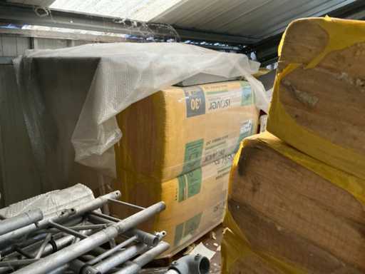 including ISOVER MULTIMAX MULTIMAX30, 1.35 x 60 x 15 cm (7 packs) and URSA TERRA 1.35 x 60 x 16 cm (12 packs), complete with some packs of RECTICEL EUROWALL 120 x 60 x 12 cm, lying on decking