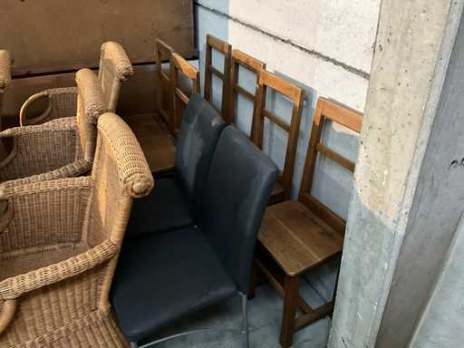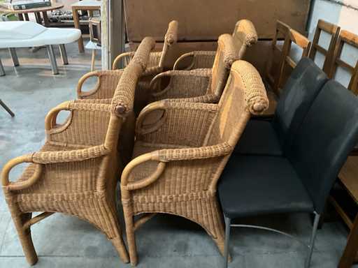 Consisting of 6x wicker woven with armrest, 2x leather look, + 6x wooden chair