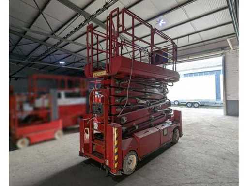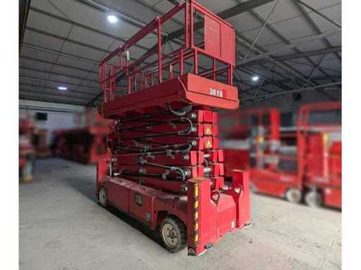 Internal No. 3010, ground clearance 0.10 m, platform length extended 3.79 m, height of transport position without railing 2.32 m, movable up to working height 17.17 m, white tyres, outdoor use only with supports, attachment points for restraint systems (PPE) available. Note Batteries defective, no function test possible, crane loading required, costs on request,