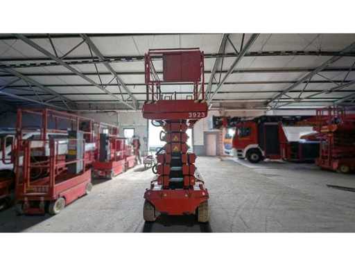 Internal No. 3923, ground clearance 0.14 m, platform length extended 3.80 m, height transport position without railing 2.25 m, white tires, anchor points for restraint systems (PPE) available. Note Batteries defective, no function test possible,