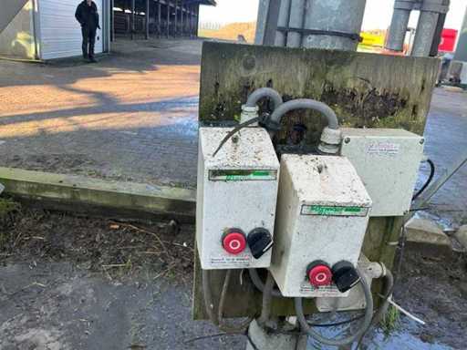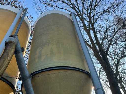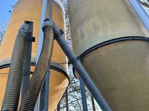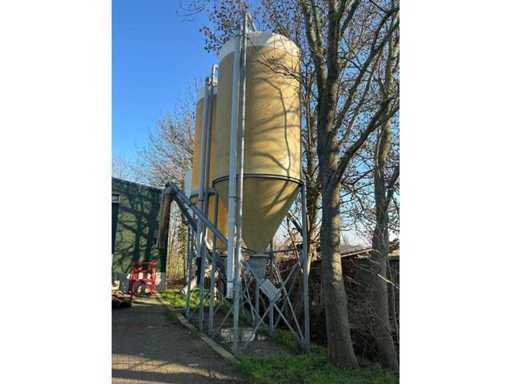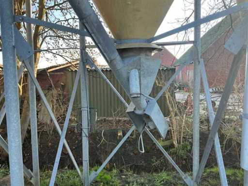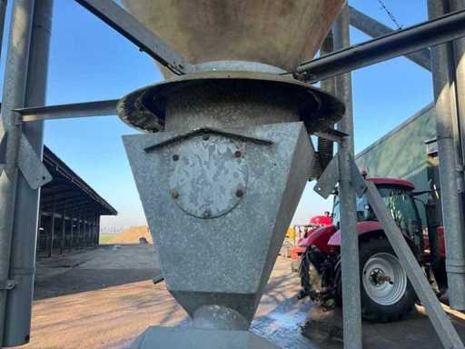 According to the specification, 23 cubic meters and about 15 tons of content. On galvanized base. Equipped with electrically operated auger Ø 140mm. Infeed silo approximately Ø 100mm.
