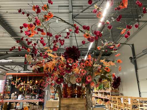 Wooden column with decorative branches with artificial flowers and vases