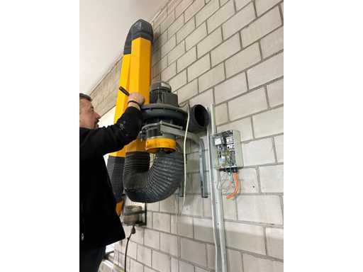 Flue gas extraction including filter unit and extraction arm for wall mounting. Little used. With mounting material.