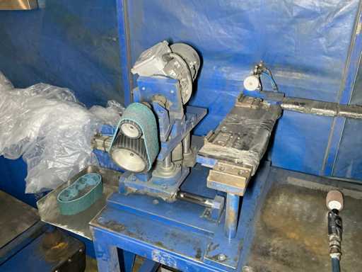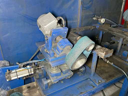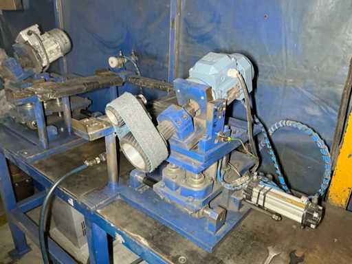 Manual polishing and deburring machine with two belt-driven polishing heads mounted on a welded steel bench.