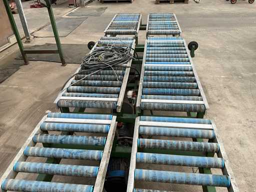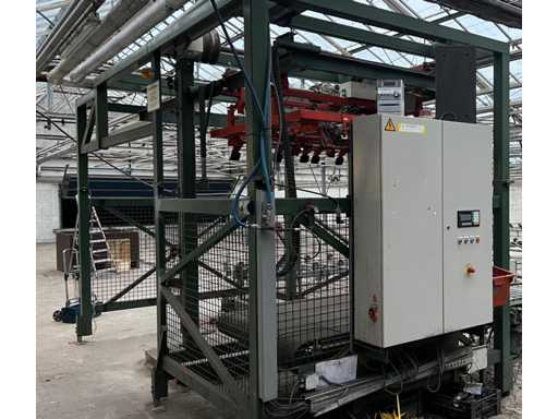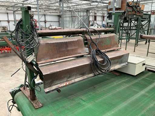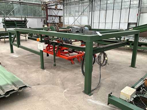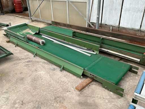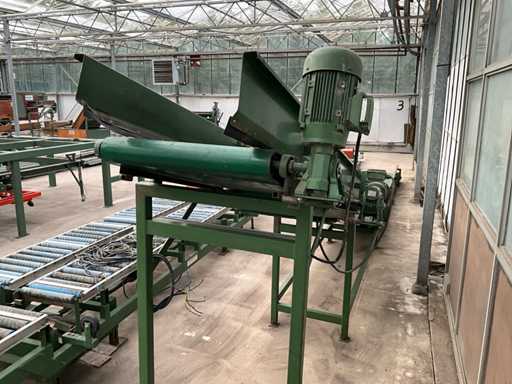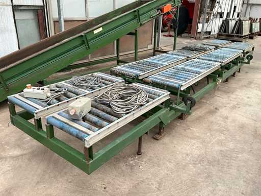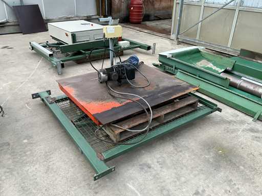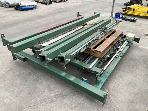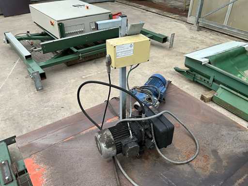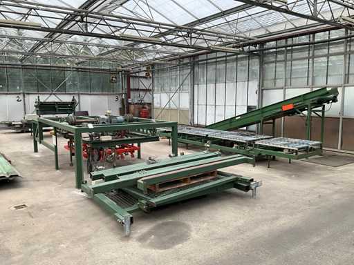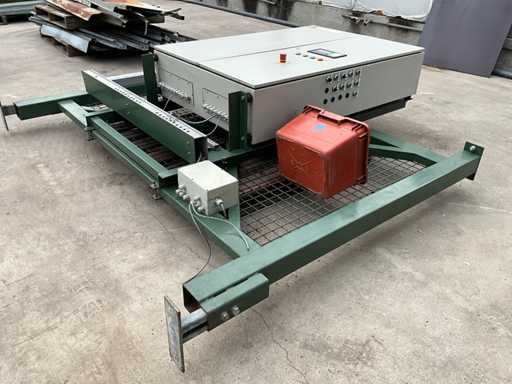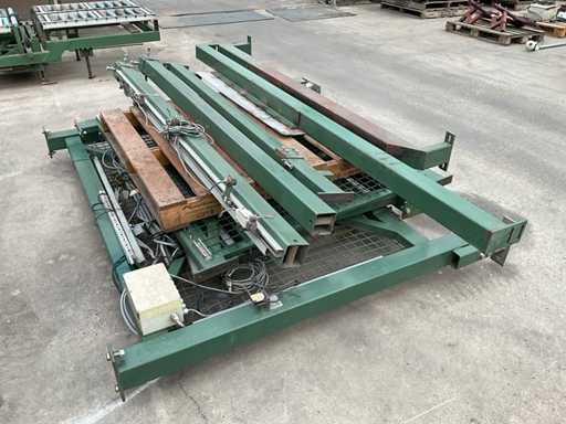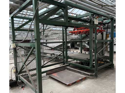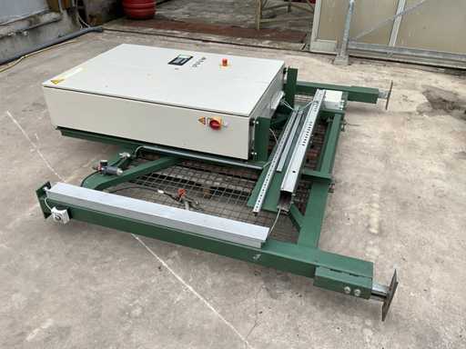 Equipped with pallet lifting platform 140x120 cm; pneumatic bin clamp (total frame size 470x230x125 cm); Keg roller conveyor 585x105x63 cm; discharge conveyor 825x90x195 cm; discharge belt 430x85x40 cm; conveyor belt with profile belt 225x160x80 cm; haulm remover; control cabinet with digital readout 100x30x140 cm; various drives; metal frames and power cables; suitable for pallets of 120x120 cm; Disassembled.