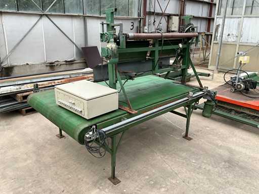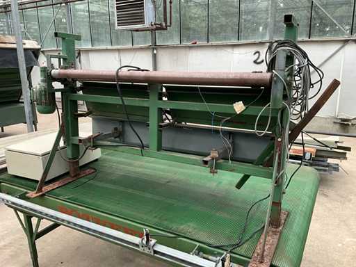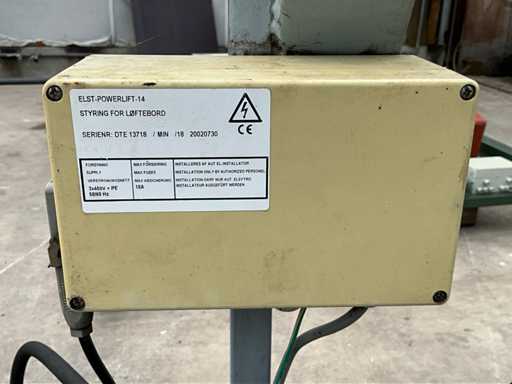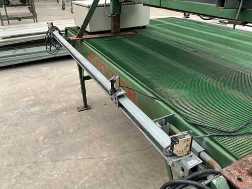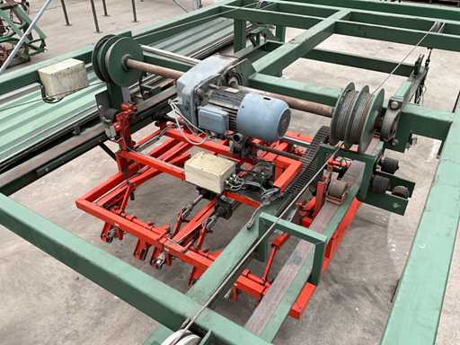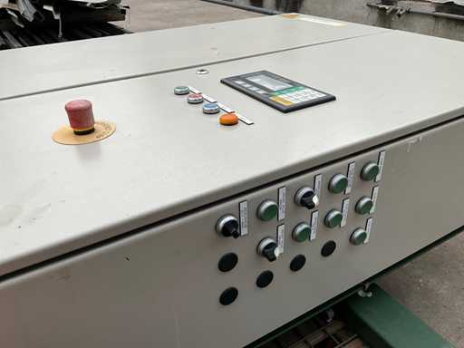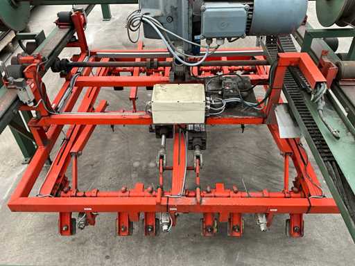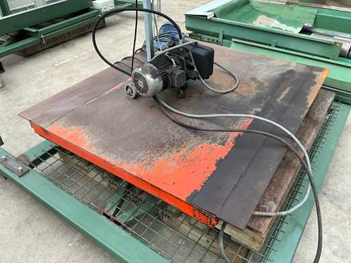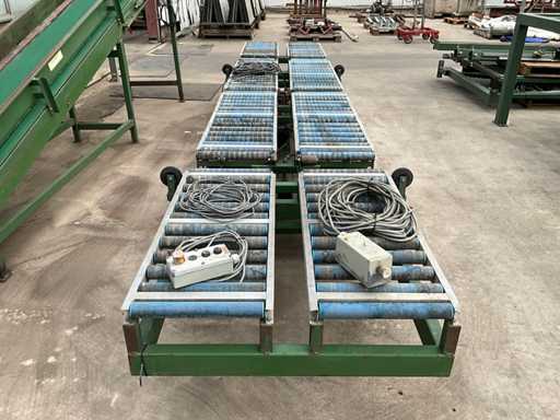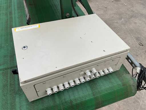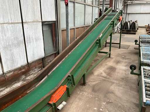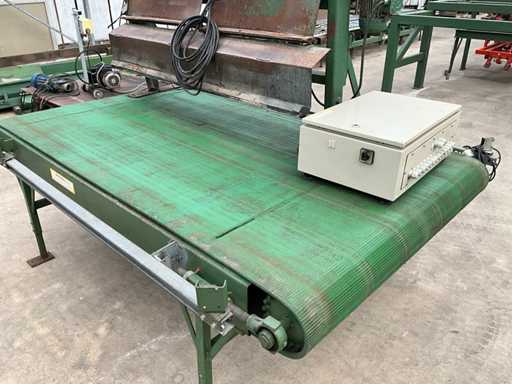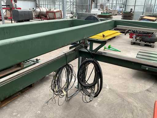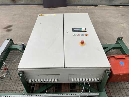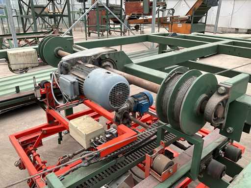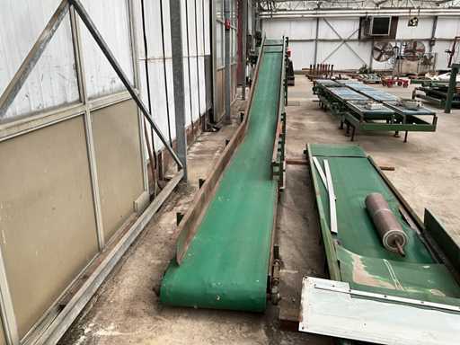 Equipped with pallet lifting platform 140x120 cm; pneumatic bin clamp (total frame size 470x230x125 cm); Keg roller conveyor 585x105x63 cm; discharge conveyor 825x90x195 cm; discharge belt 430x85x40 cm; conveyor belt with profile belt 225x160x80 cm; haulm remover; control cabinet with digital readout 100x30x140 cm; various drives; metal frames and power cables; suitable for pallets of 120x120 cm; Disassembled.