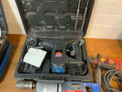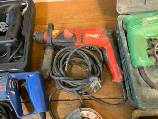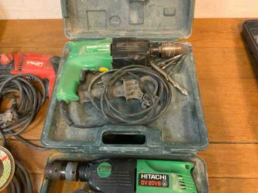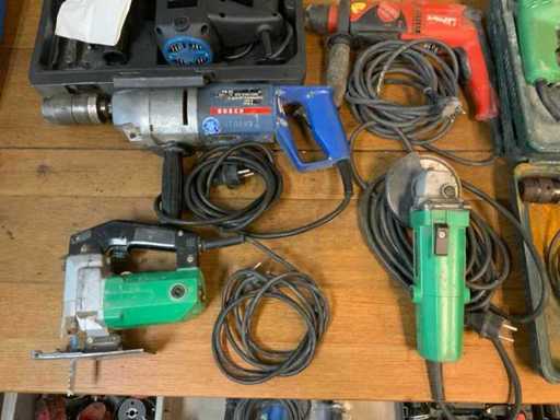 including: 1 Hitachi jigsaw, 1 angle grinder, 5 drills