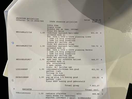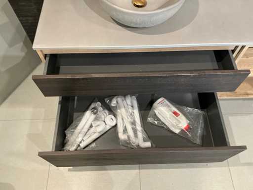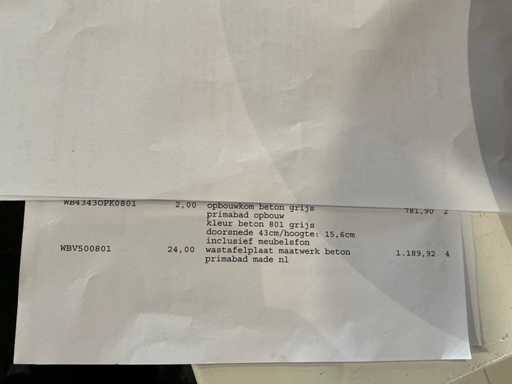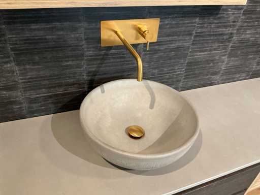 Consisting of 2x base cabinet (56x50x100cm) with asymmetrical drawers, open intermediate cabinet (40x49x56cm), 2x washbasin concrete gray (color 801) 43x15.6cm, sink plate custom concrete (240x50x2cm), Paffoni Light surface-mounted part sink tap without built-in part. Same design as lot 192 and 194