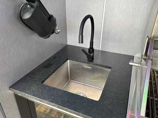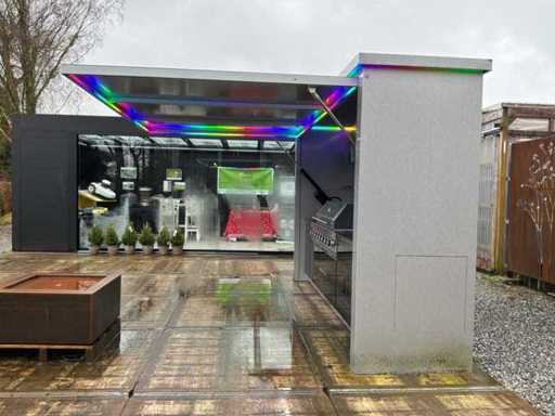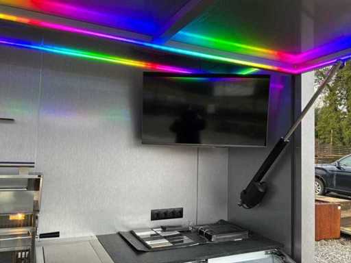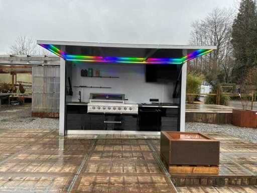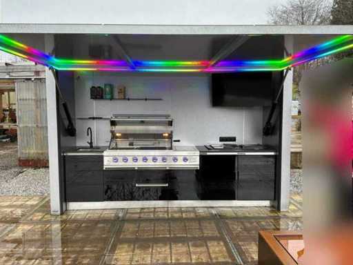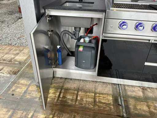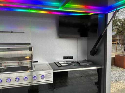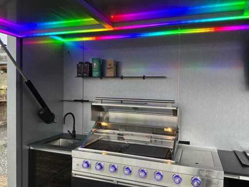 Equipped with an XXL gas barbecue (147 cm), sink with tap, jack door with remote control opening system. LED lighting.