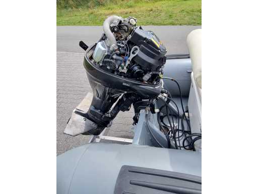 The boat remains well pressurized. The tubes are not leaking, nor are there stickers. The engine is starting and running and equipped with electric start.