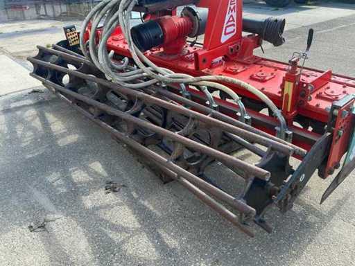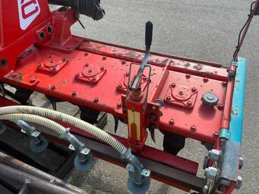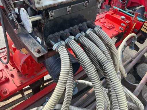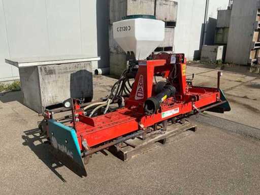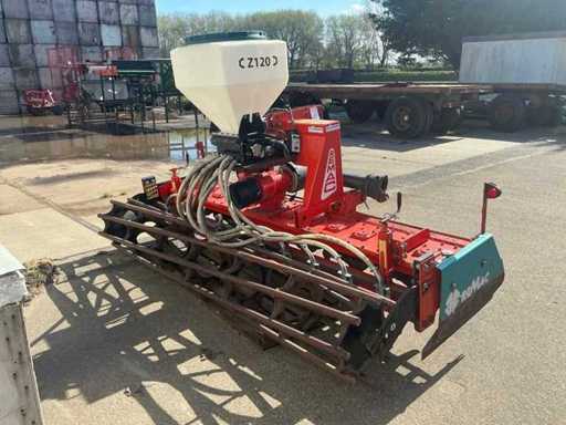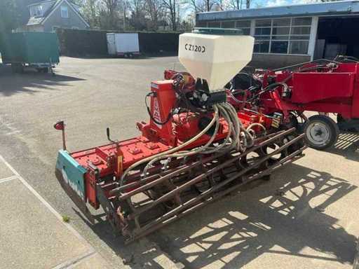 Equipped with, among other things: three-point device, PTO drive, 12 rotors, manually height-adjustable leveling beam, cage roller Ø 440mm, Delimbre Pneumatic seed tank construction, equipped with 10 outlets from year 2019.