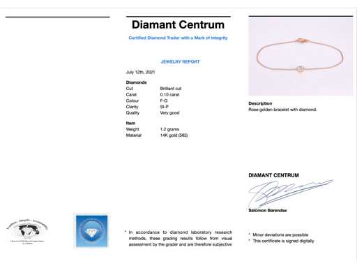 Diamond: Natural; Cut: Brilliant cut; Weight (carat): 0.10 carat; Color: F-G; Purity: SI-P; Cut quality: Very nice; Jewel: Bracelet; Weight: 1.2 ounces; Dimensions/length: 18 cm; Material: 14 carat (585); Condition: New; Packing: Luxury jewelry box; Explanation: The quality has been taken from the report belonging to the item. The valuation is an assessment of a certified diamond dealer, based on consumer prices; Consumer price: € 1,085