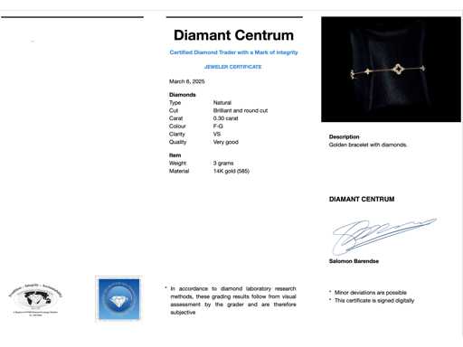 Diamond: Natural; Quantity: 48 pieces; Cut: Brilliant and round cut; Weight (carat): 0.30 carat; Color: F-G; Purity: USA; Cut quality: Very nice; Jewel: Bracelet; Weight: 3 grams; Material: 14 carat (585); Condition: New; Packing: Luxury jewelry box; Explanation: The quality has been taken from the report belonging to the item. The valuation is an assessment of a certified diamond dealer, based on consumer prices; Consumer price: € 2,450