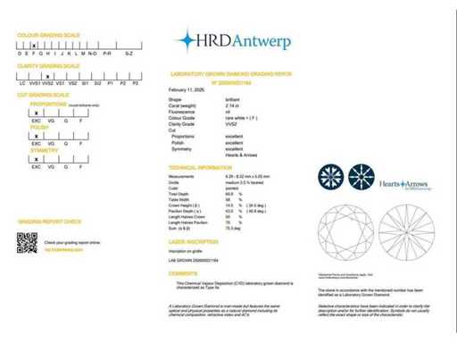 This lab-grown diamond comes with an official HRD certificate and report confirming its quality. View the certificate in the photos or refer to the table above for the detailed specifications. All characteristics have been taken directly from the accompanying report.