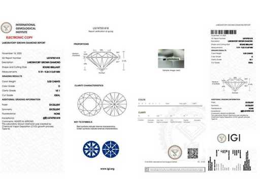 Certificate & Specifications This lab-grown diamond comes with an official IGI certificate and report confirming its quality. View the certificate in the photos or refer to the table above for the detailed specifications. All characteristics have been taken directly from the accompanying IGI report. What is a lab-grown diamond? A lab-grown diamond is produced in a controlled laboratory environment with advanced technology. It has the same chemical, physical and optical properties as a natural diamond, but is manufactured without mining. This makes it a sustainable and ethical alternative and is certified according to the same quality standards as natural diamonds.