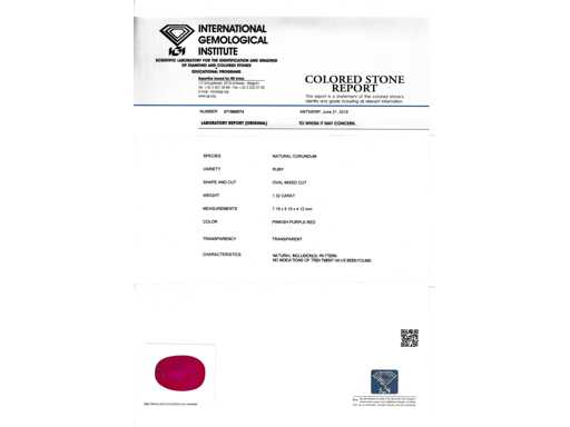 Diamond: Natural; Quantity: 1 piece; Cut: Oval cut; Weight (carat): 1.32 carat; Color: Pinkish purple-red; Purity: With natural inclusions; Certificate: IGI; Certificate number: 371988574; Condition: New; Packing: Gem Box; Explanation: The quality has been taken from the report belonging to the item. The valuation is an assessment of a certified diamond dealer, based on consumer prices; Consumer price: € 5,000