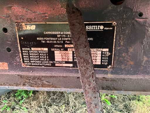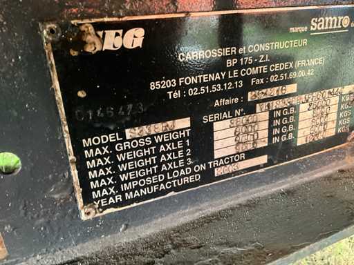 Vehicle Category Trailer (O4) Body type Semi-trailer (DA) Interior of the open car Brand SAMRO Type Not registered Variant Not registered Execution Not registered Trade name S338 RJ Type-approval number Not registered Length 1370 cm Width 255 cm Number of axles 3 Number of wheels Not registered Wheelbase 900 cm Maximum construction speed 100 km/h Distance center coupling to rear of vehicle 1200 cm Payload 30390 kg