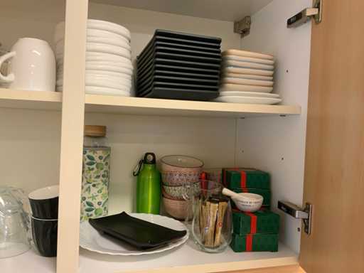 Consisting of various mugs, microwave, caterchef toaster, kettle, grill, cleaning utensils, contents of the kitchen cabinets