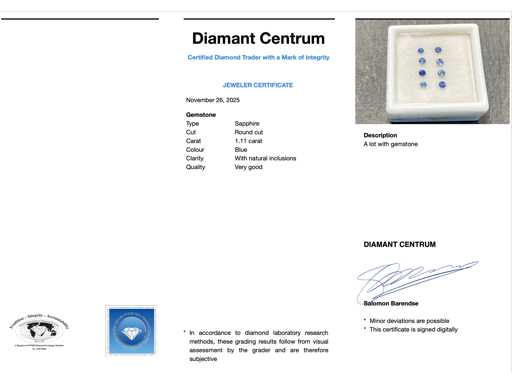 Gemstone: Sapphire; Quantity: 8 pieces; Cut: Round cut; Weight (carat): 1.11 carat; Color: Blue; Purity: With natural inclusions; Cut: Very good; Condition: New; Packing: Gem Box; Explanation: The quality has been taken from the report belonging to the item. The valuation is an assessment of a certified diamond dealer, based on consumer prices; Consumer price: € 980,-
