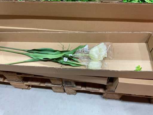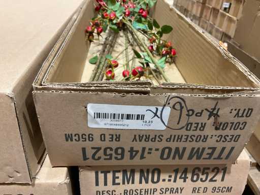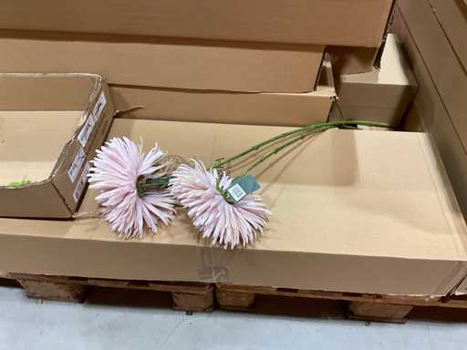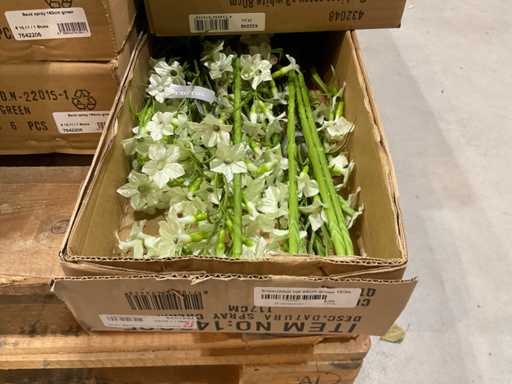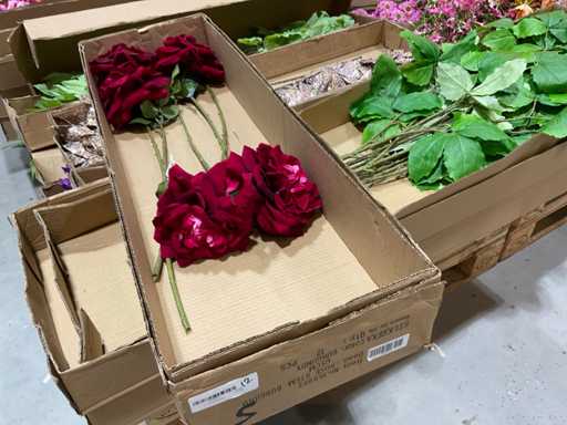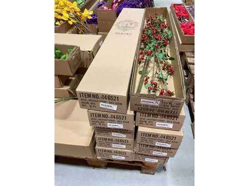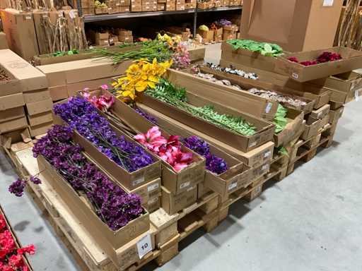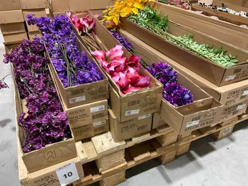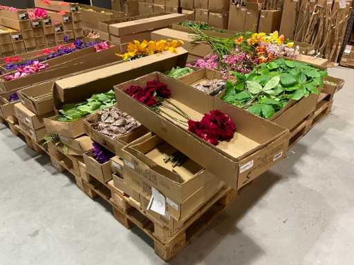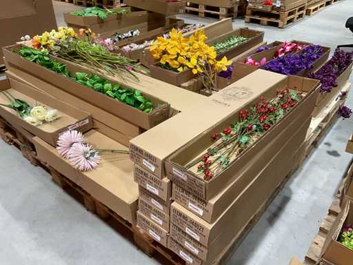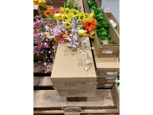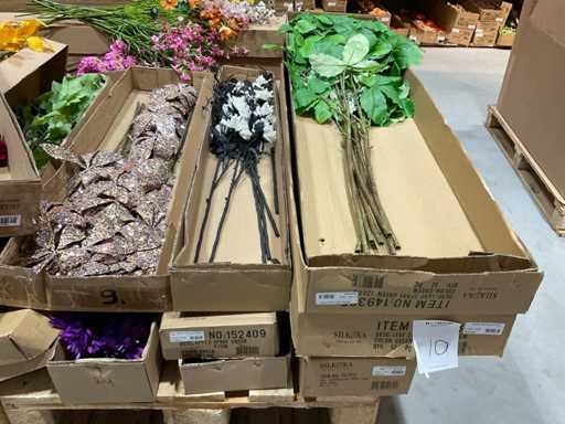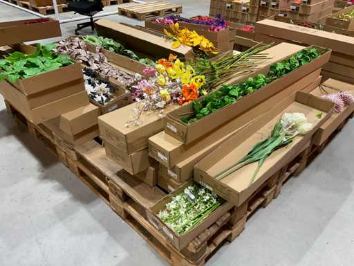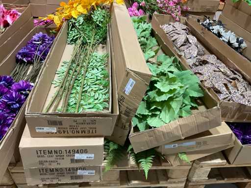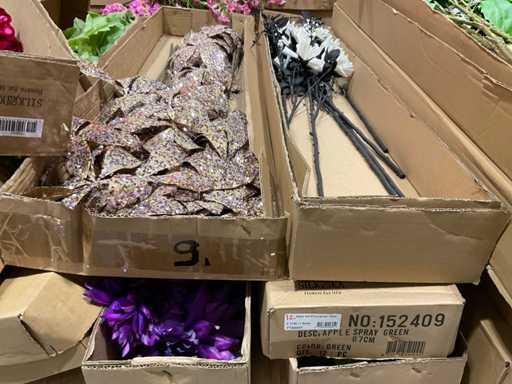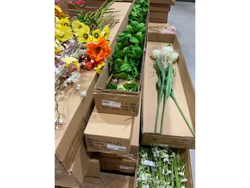 Various boxes of artificial flowers and branches in various shapes and sizes