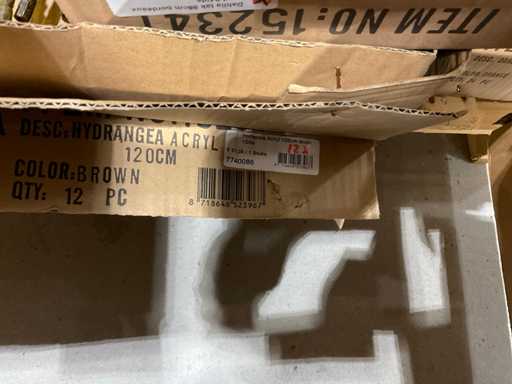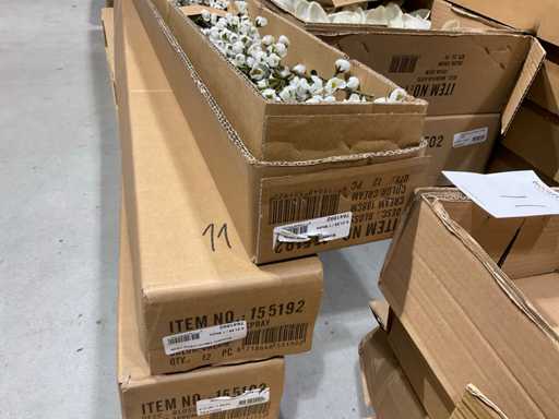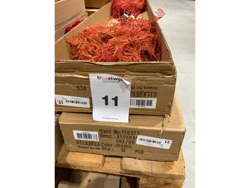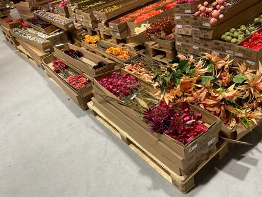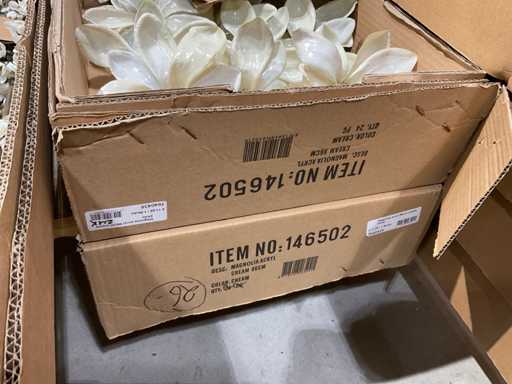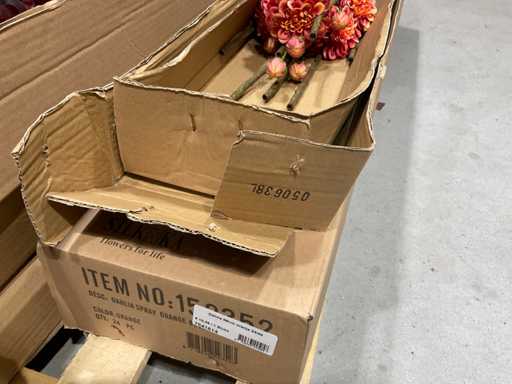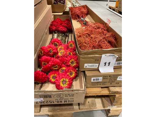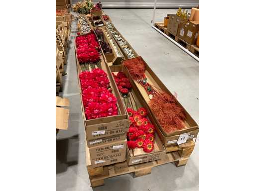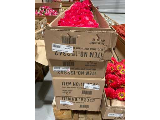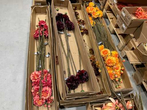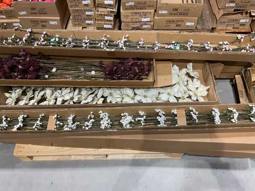 Various boxes of artificial flowers and branches in various shapes and sizes