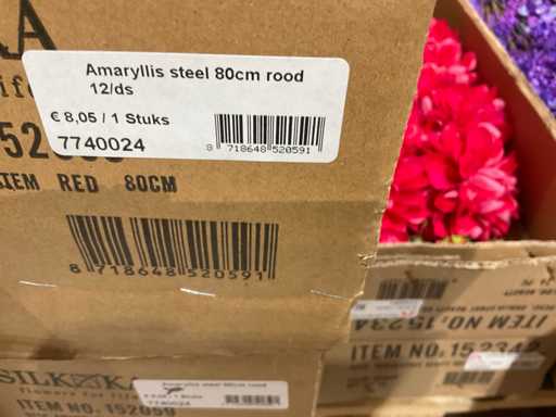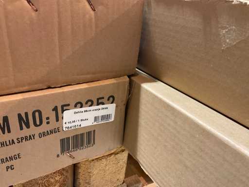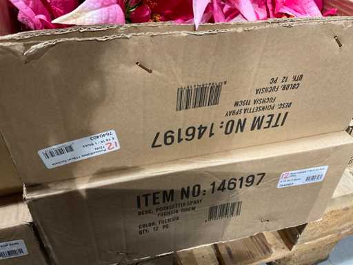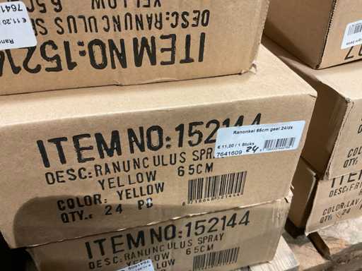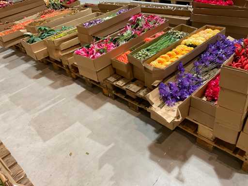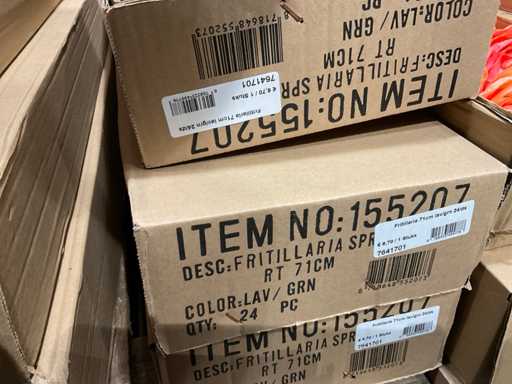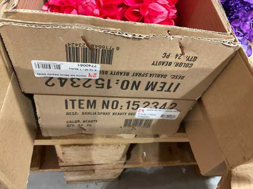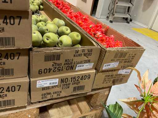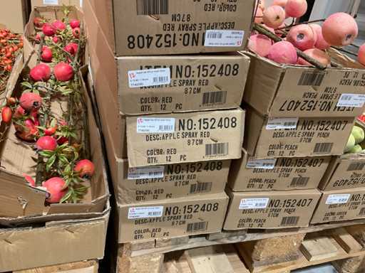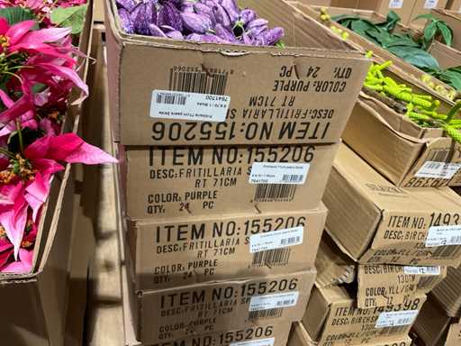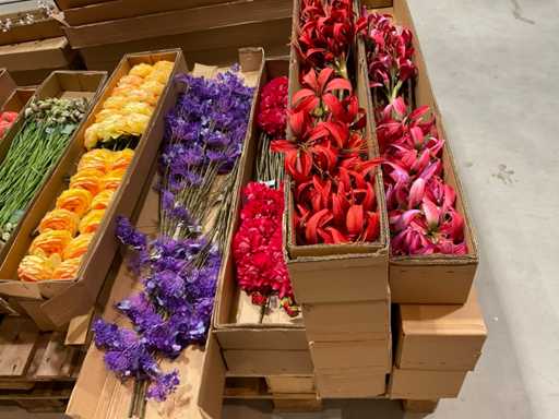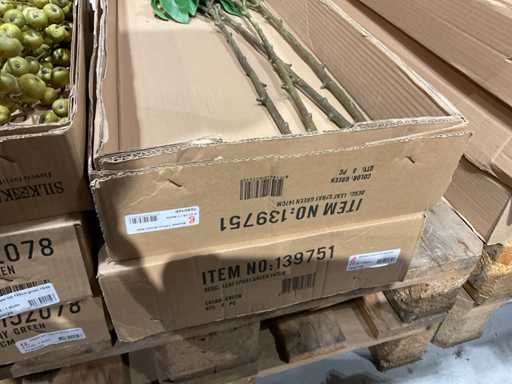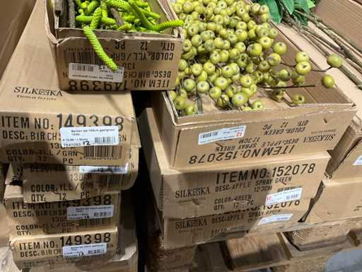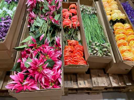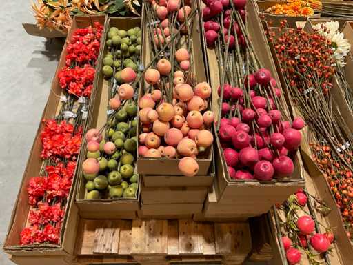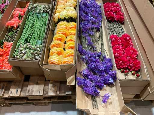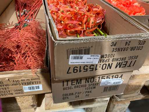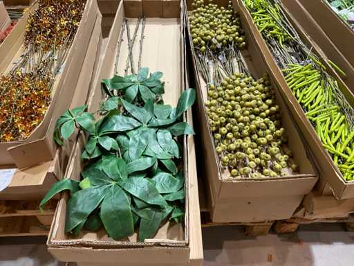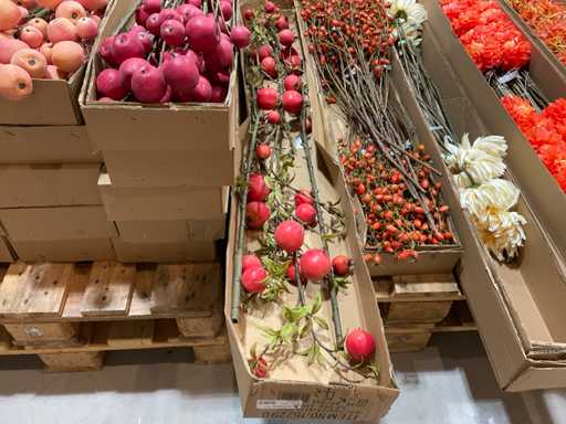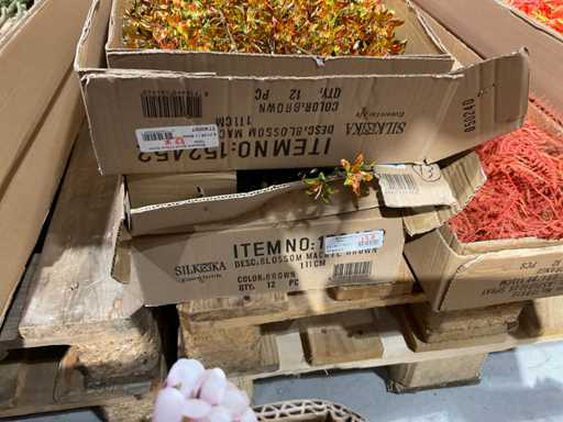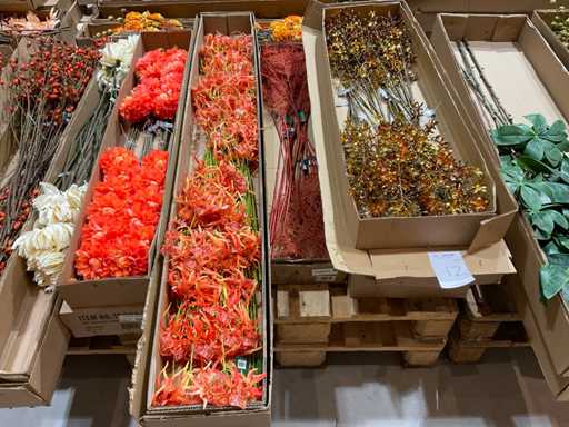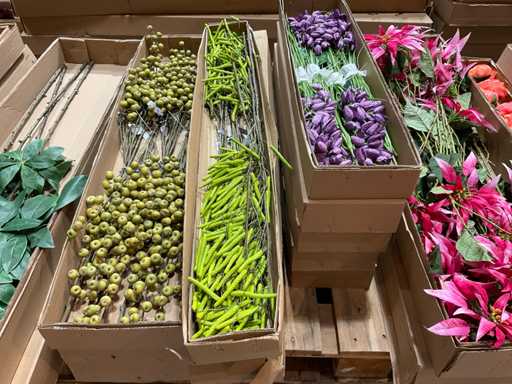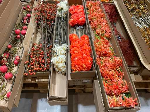 Various boxes of artificial flowers and branches in various shapes and sizes