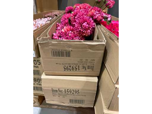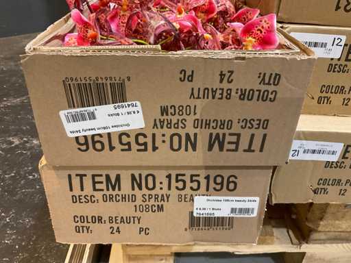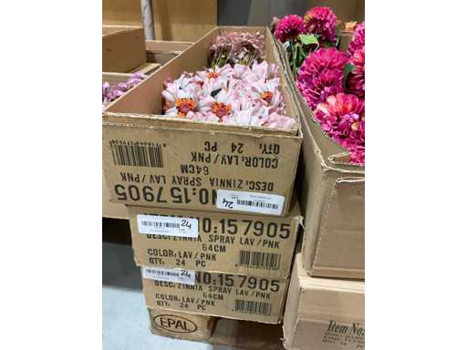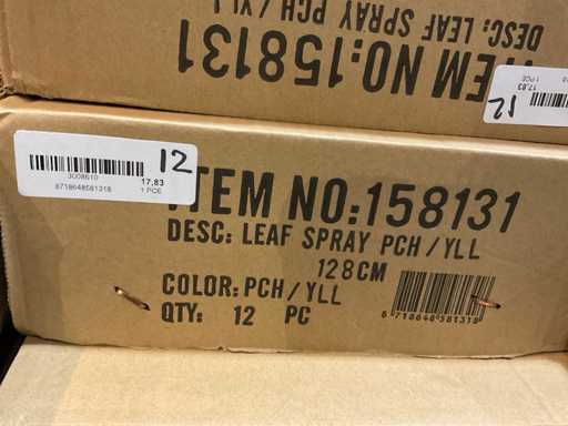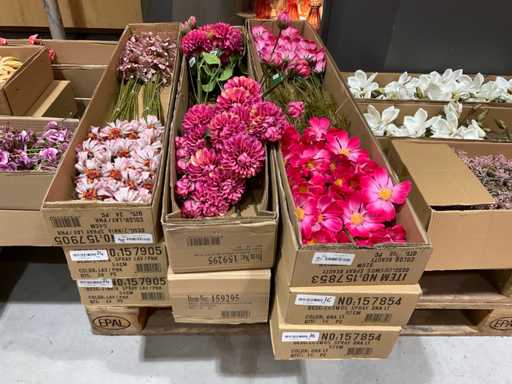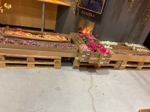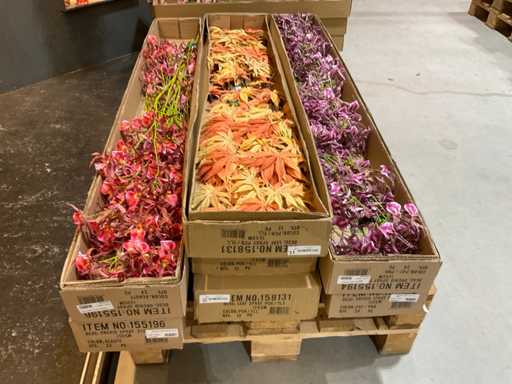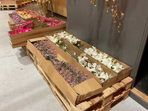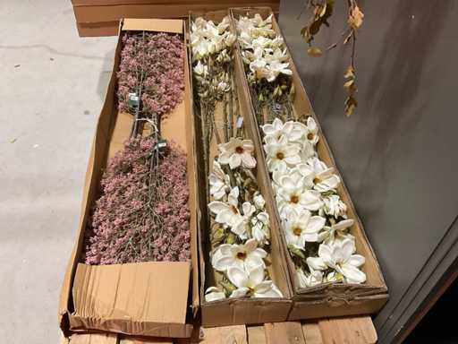 Various boxes of artificial flowers and branches in various shapes and sizes