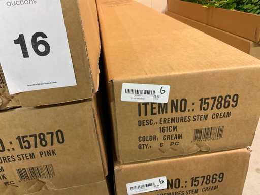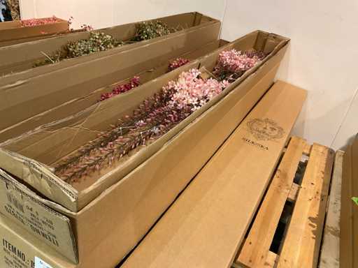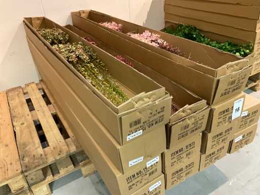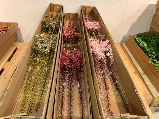 Various boxes of artificial flowers and branches in various shapes and sizes