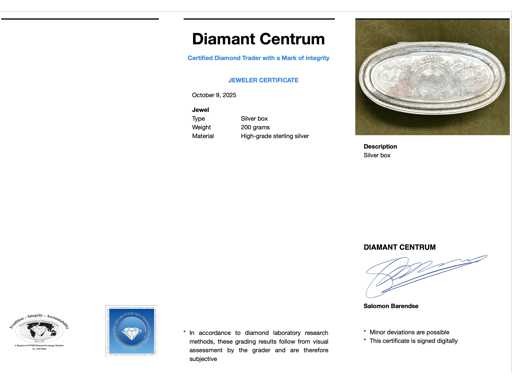Jewel: Silver box; Weight: 200 grams; Material: High grade sterling silver; Condition: Vintage; Explanation: The quality has been taken from the report belonging to the item. The valuation is an assessment of a certified diamond dealer, based on consumer prices; Consumer price: € 3,080