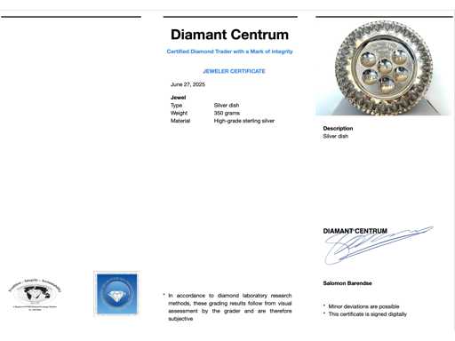 Jewel: Silver dish; Weight: 350 grams; Material: High grade sterling silver; Condition: Vintage; Explanation: The quality has been taken from the report belonging to the item. The valuation is an assessment of a certified diamond dealer, based on consumer prices; Consumer price: € 6,615