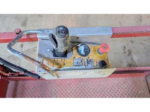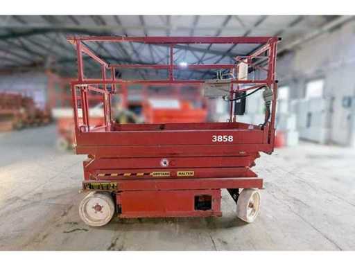 Internal No. 3858, ground clearance 0.08 m, lifting capacity on extension 136 kg, height transport position without railing 1.18 m, white tires, anchorage points for restraint systems (PPE) available. Note Batteries are missing, charger is missing,