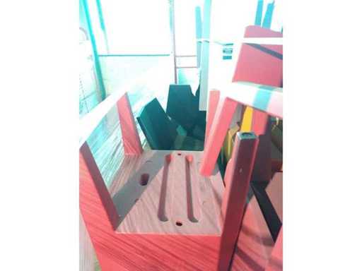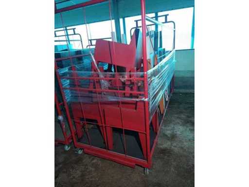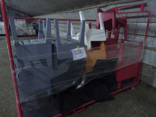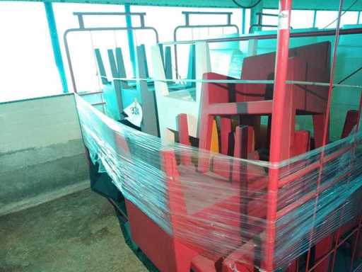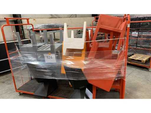Industrial trolley (2620x1100x1850) with 5 JUT chairs in red, 2 white, 5 grey, 2 orange, 2 black VERTEX chairs