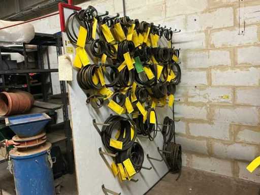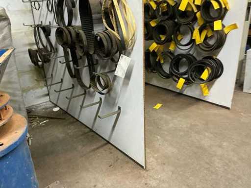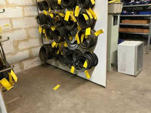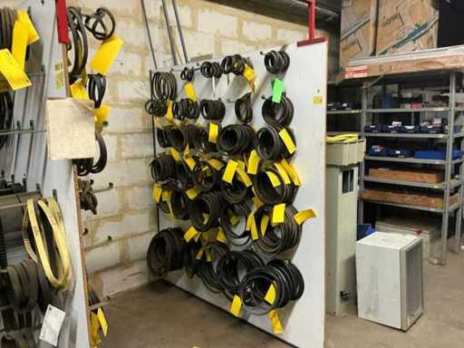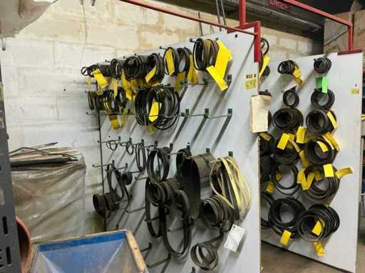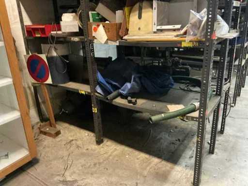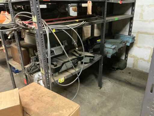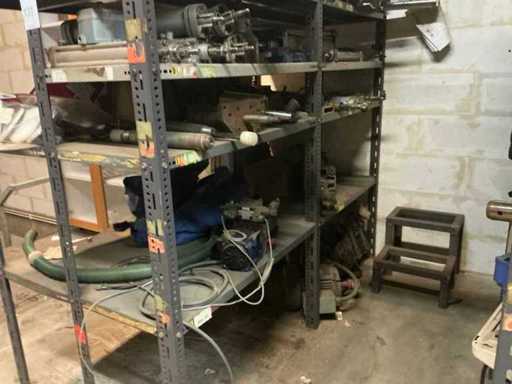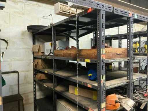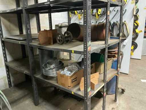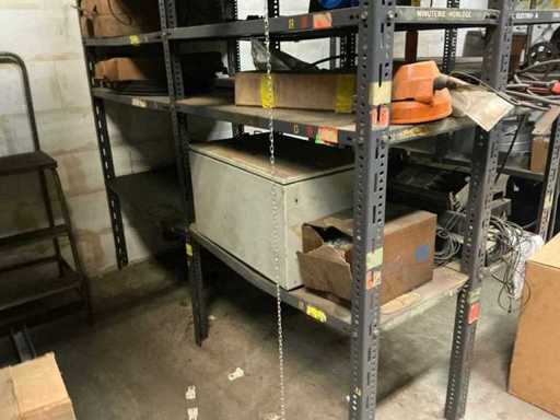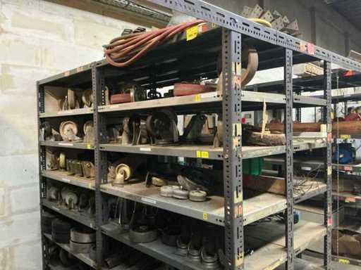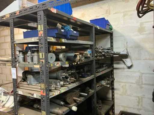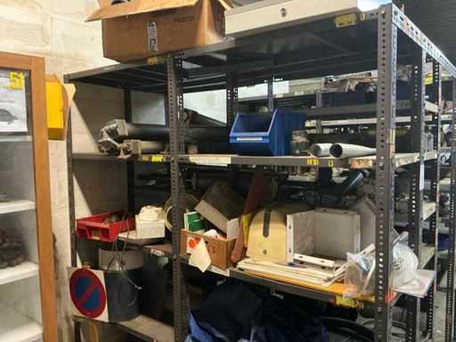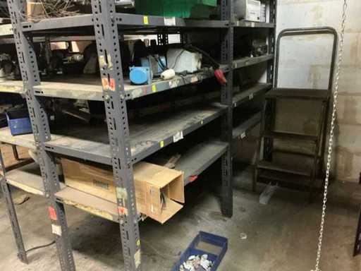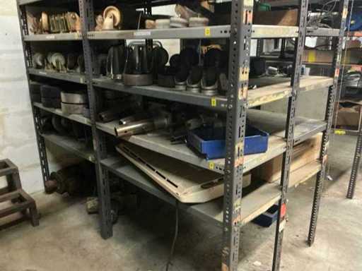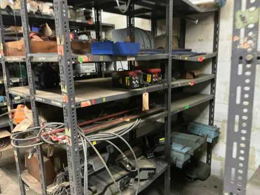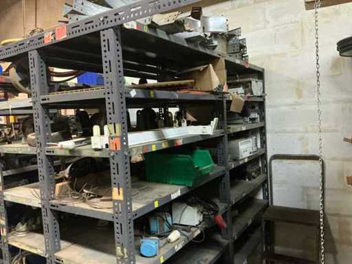 Racks and cabinets with industrial spare parts; around 16 sections racks