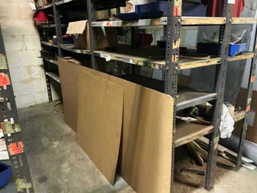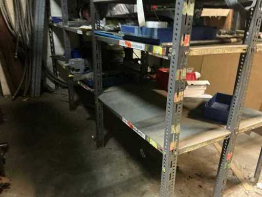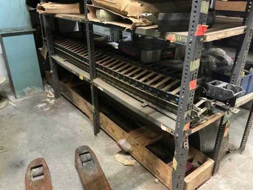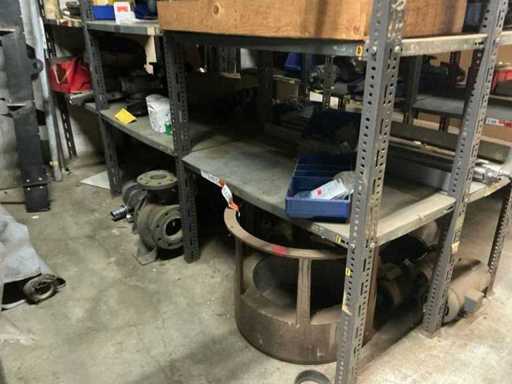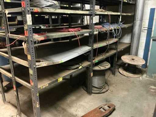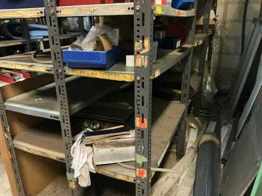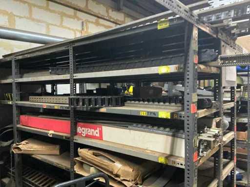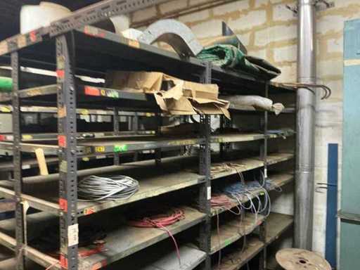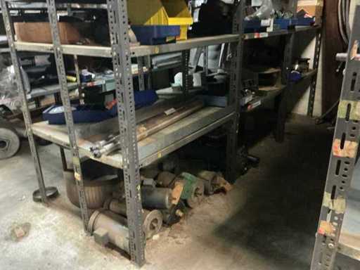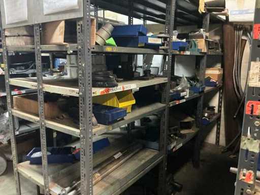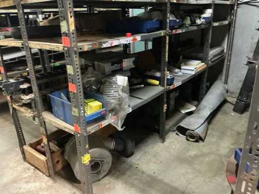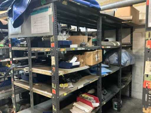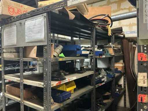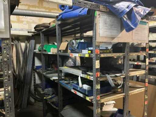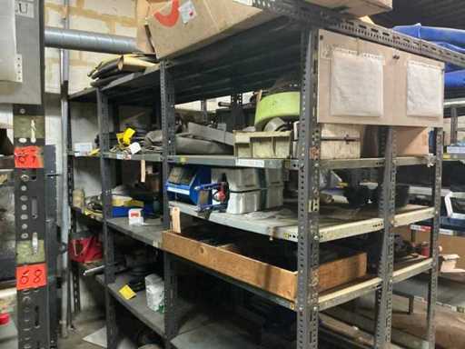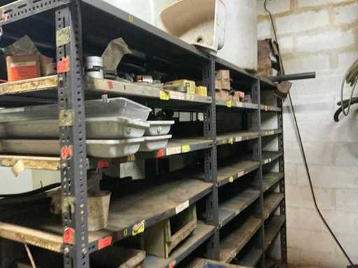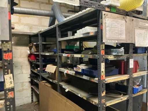 Racks and cabinets with industrial spare parts; around 24 sections racks