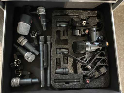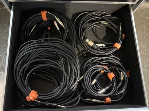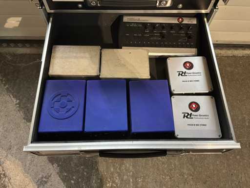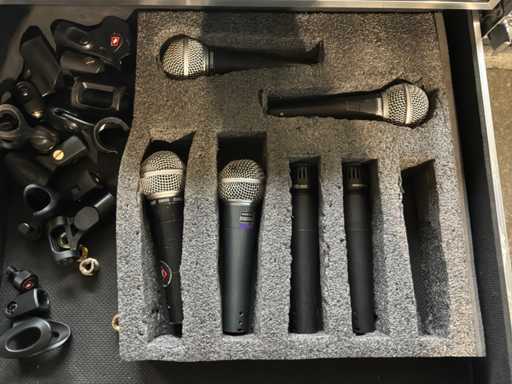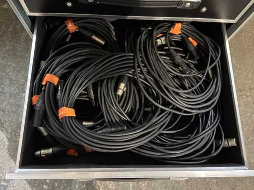 Stage rack equipped with: various cables, Shure microphones (6x), 5 x Klark Tecnik DI, 2x Powerdynamics DI, 1x Behringer monitor mixer, 2x drum microphone set 1x unbranded, 1- t.bone. 1X shure beta 91A, 2x Senheiser e906, various sales cables, XLR cables, 1x stage block 10 channel.