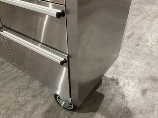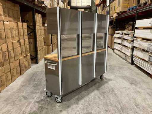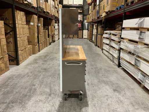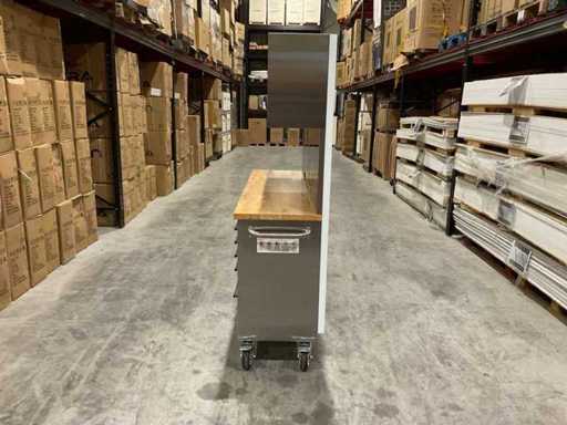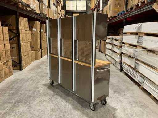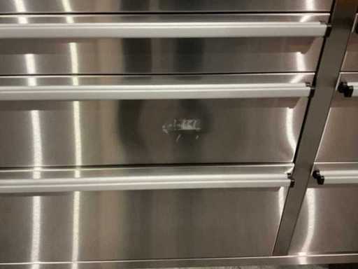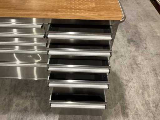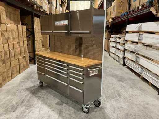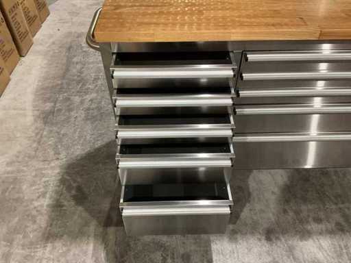 Equipped with all 430 anti-fingerprint stainless steel; 15 drawers; 3 high cabinets; back wall; 35 mm wooden worktop; 2 handles; 4 x 6 inch wheels of which 2 wheels with brakes; lockable by means of a key; Unused in box (transport dimensions 190x55x130 cm)