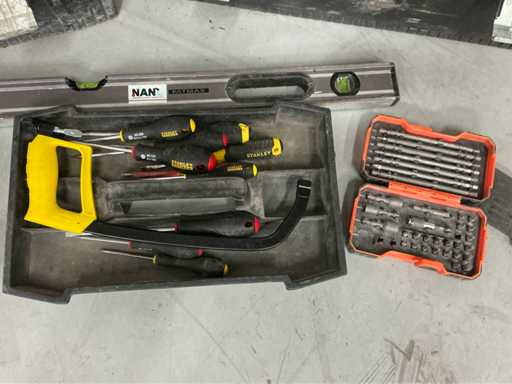 Containing batch of various hand tools including screwdrivers, drills, ring/spanners, pliers, various gauges, bit set and 1 spirit level,