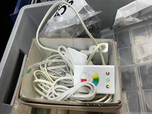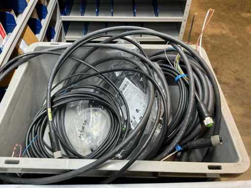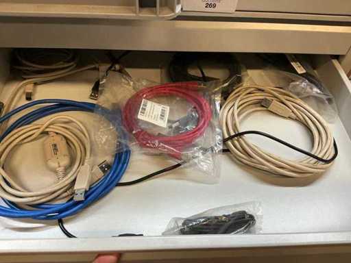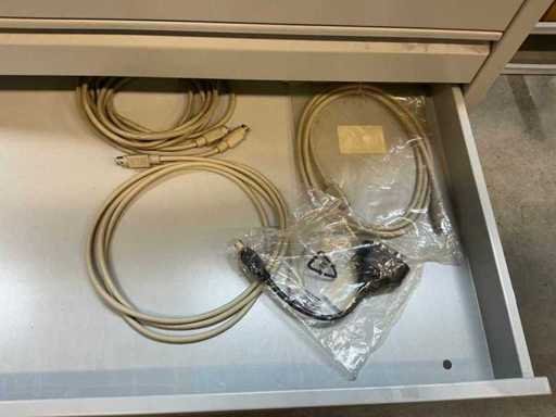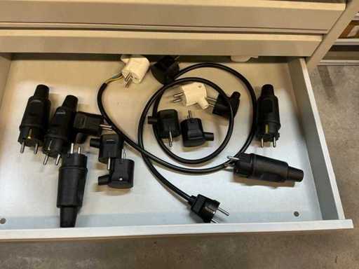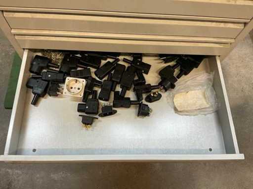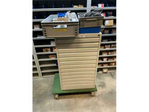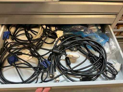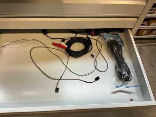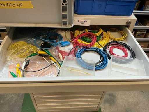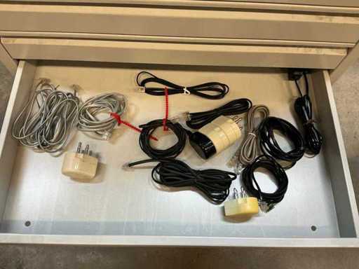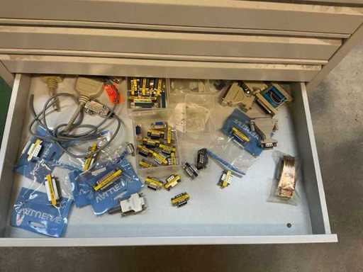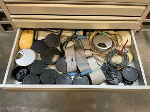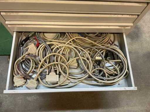 Equipped with 13 drawers with various cables and plugs and 3 crates with contents