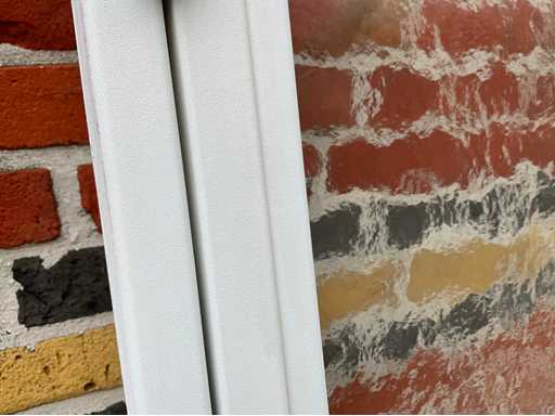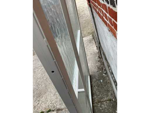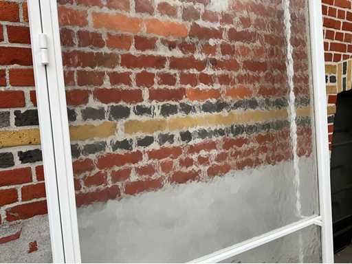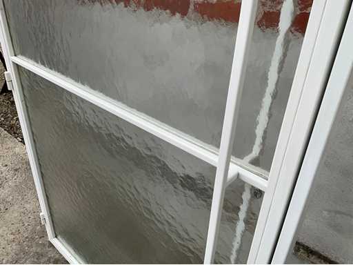 Industrial interior door in white powder-coated steel (RAL 9005) - equipped with Katedralna safety glass (puckered structure glass) - Dimensions 2375 x 1067 x 40 mm, left turning - Equipped with steel handle on both sides and sturdy paumelle hinges - New and never installed - suitable for both modern and industrial interiors - for a fee it can be delivered within Belgium.