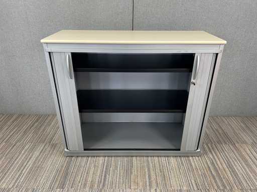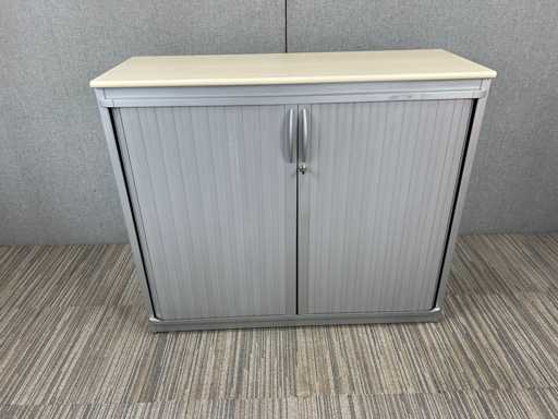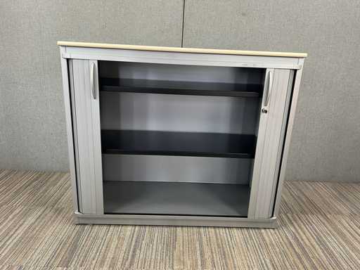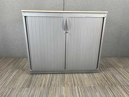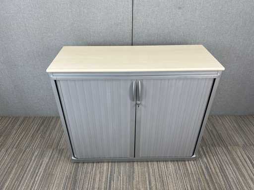 Half-height roller door cabinet Steelcase, metal frame with plastic roller doors, maple top, 2 shelves per cabinet.