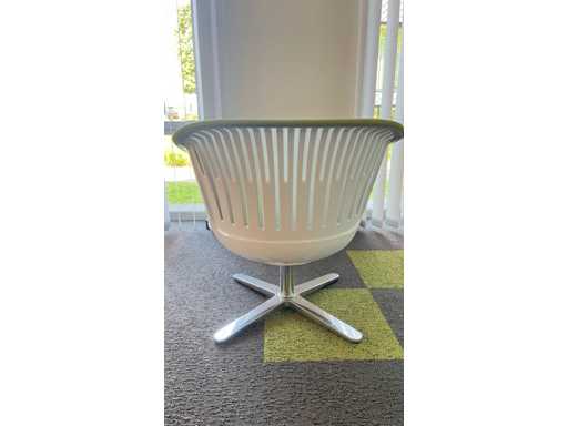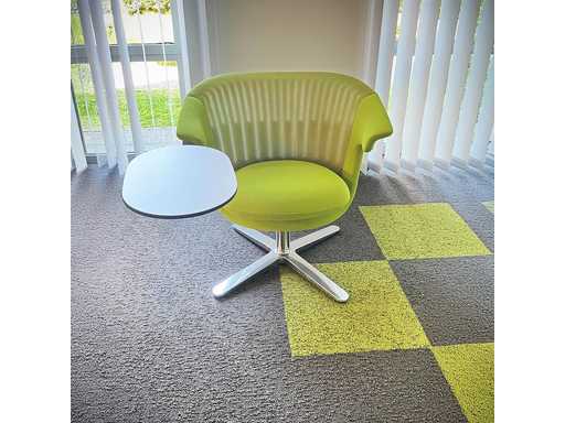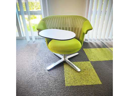 Steelcase i2i collaborative lounge chair in green fabric and mesh backrest. Comes with an integrated white table. The chair is rotatable and stands on an aluminum base. Ideal for informal workplaces or waiting areas.