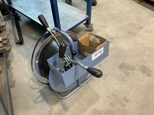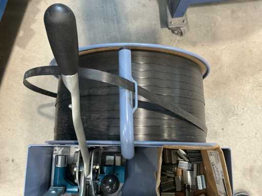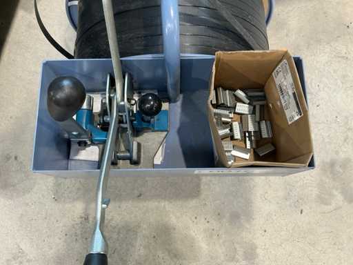 Unwind stand, reel tensioner, polyester strapping, locking clamps