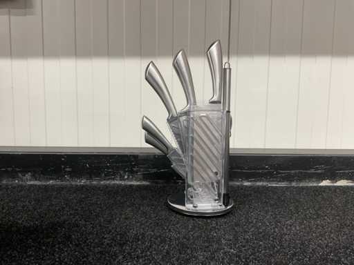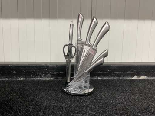 Equipped with stainless steel; ergonomic non-slip handle; laser-ground; chef's knife; bread knife; cleaver; carving knife; filleting knife; paring knife; knife sharpener; rves knife block; Unused in box