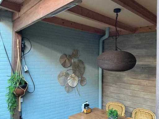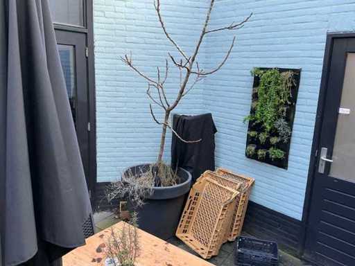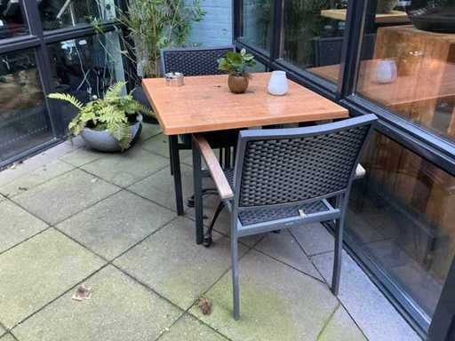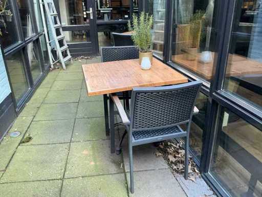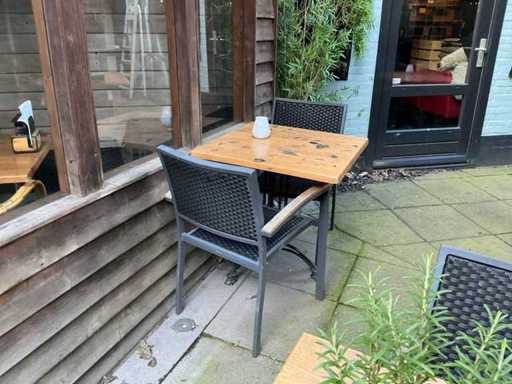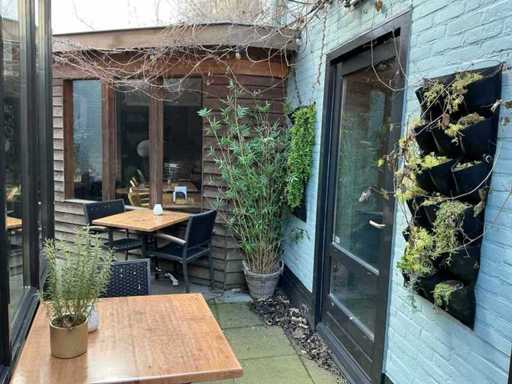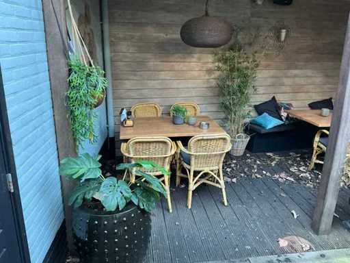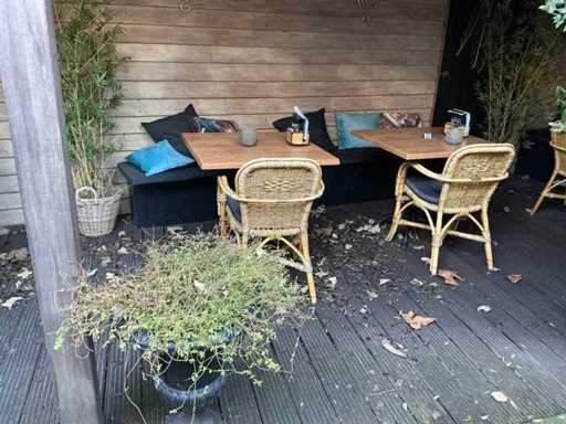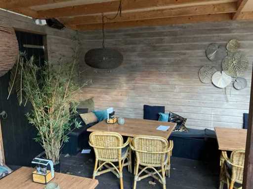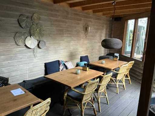 Consisting of: 8 tables of 80x80x72cm, 4 tables of 120x80x73cm, 12 terrace chairs from Vervoort, 12 woven chairs from Aangeenbrug's Mandenmakerij, 18 decorative cushions, 4 heaters, 2 Bose speakers, 6 artificial plants, 5x wall decoration, 4 hanging lamps, a parasol and 3 plants. The loosely parceled olive tree is not included.