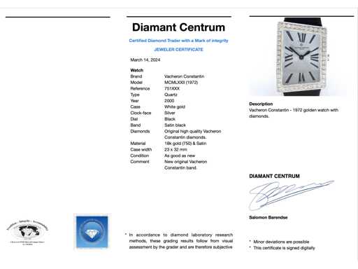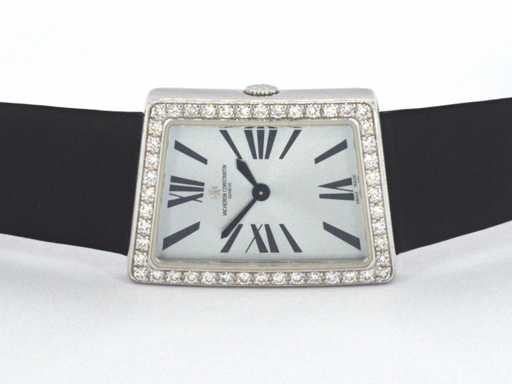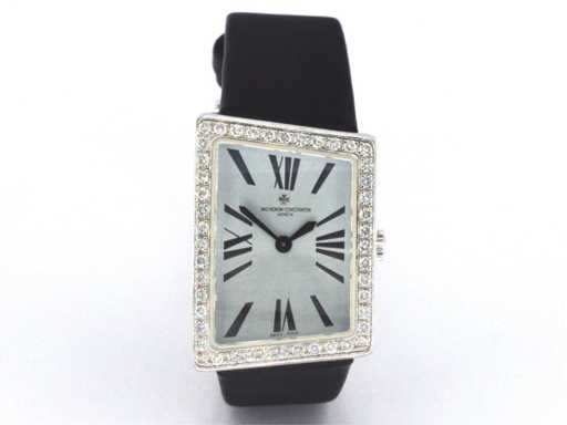 Watch (Brand): Vacheron Constantin; Model: 1972 (MCMLXXII; Reference: Serie751***; Year: 2000; Dial: silver; Clock (type): Quartz; Case diameter: 23 x 32 mm; Strap: Satin (new); Accessories: New original Vacheron Constantin strap in black satin; Jewel: Watch; Material: 18K gold (750); Condition: As good as new; Packing: Luxury jewelry box; Note: The quality has been taken from the report belonging to item; Additional information: Original high quality Vacheron Constantin diamonds;