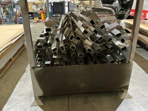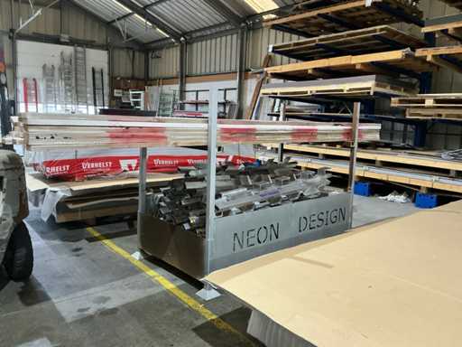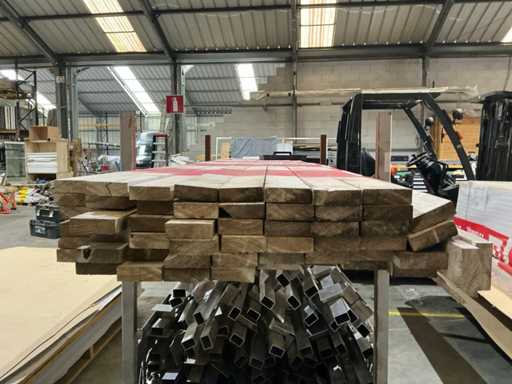 Aluminum holders including approximately size 175 x 14 x 8 cm with 4 levels complete with 54 wooden beams / barriers with length approximately 4 m, lying in metal trestle, including trestle